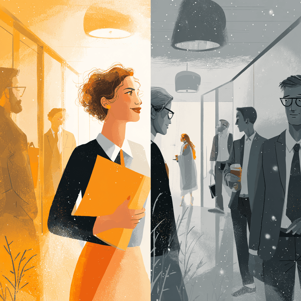 A tensão paira no ar. Os colaboradores evitam contato visual, caminham apressados pelos corredores com precisão mecânica. As conversas parecem transacionais, desprovidas de calor humano.